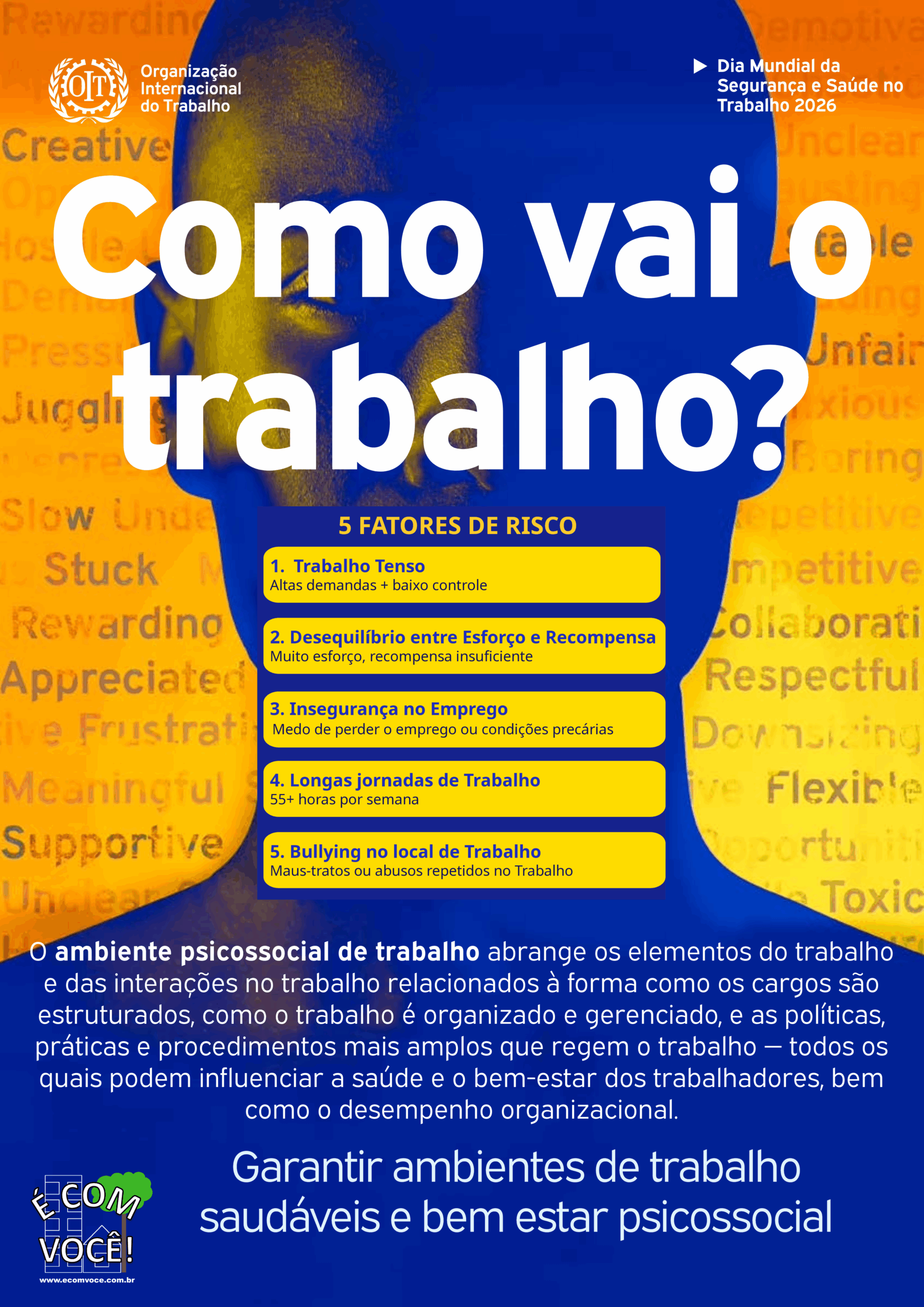 O tema escolhido pela OIT para o Dia Mundial da Segurança e Saúde no Trabalho em 2026 é: Vamos garantir um ambiente de trabalho psicossocial saudável.